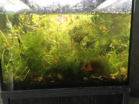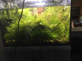 Ein bisschen hatte ich die Lust an dem Aquarium verloren, weil ich da heftige Fadenalgen drinhatte, seit ich das Teil auf LED-Beleuchtung umtestellt hatte. Dank einem Dauerdünger (von Drak Aquaristik, Aquafim-System) im Filter, zügellosem Wuchernlassen der Pflanzen und einer reduzierten Beleuchtungszeit sind die nun ganz ohne Absammeln komplett weg, genauso wie die meisten der Wasserlinsen. Das war ja schonmal schön.