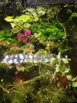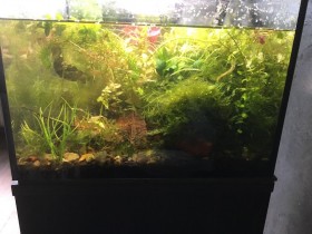 Ein bisschen hatte ich die Lust an dem Aquarium verloren, weil ich da heftige Fadenalgen drinhatte, seit ich das Teil auf LED-Beleuchtung umtestellt hatte. Dank einem Dauerdünger (von Drak Aquaristik, Aquafim-System) im Filter, zügellosem Wuchernlassen der Pflanzen und einer reduzierten Beleuchtungszeit sind die nun ganz ohne Absammeln komplett weg, genauso wie die meisten der Wasserlinsen. Das war ja schonmal schön.