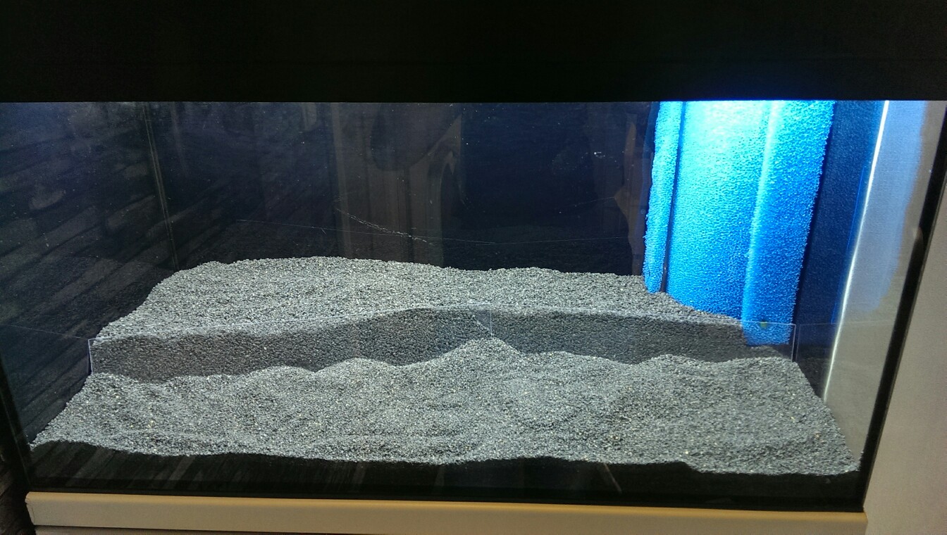 Die folgenden Bilder zeigen die Entstehung: den Basalt hab ich beim waschen gesiebt, so hab ich eine gröbere Körnung für den hinteren, höheren Aufbau und vorne etwas feiner und deutlich flacher. So haben die Pflanzen hinten einen größeren Wurzelraum und durch die Stufe, die ich mit zwei Plexiglasstreifen abfange, eine gute Tiefenwirkung. Vorne sinken evtl vorhandene Futterreste durch die feinere Körnung nicht so tief ein und ich kann leichter Mulm absaugen. Die Wurzen sollen wie zwei Wurzelstöcke wirken, die im Wasser stehn, hoffe durch passende Bepflanzung dein Eindruck auf Dauer zu erziehlen :/