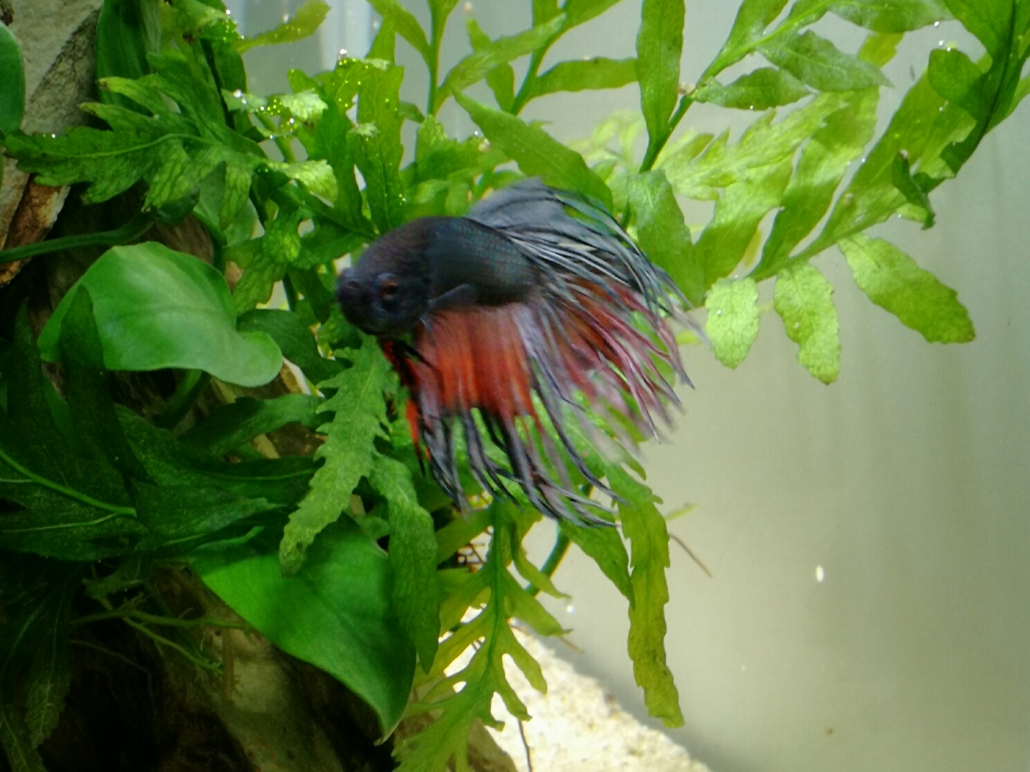 Kevin. Unser Kampffischmännchen. Lieber Kerl, recht ruhig, wunderschön, verfressen. Er stöbert trotzdem überall rum. Die großen interessieren ihn nicht. Das er Kleine erwischt war kalkuliert, aber quasie alle? :o Es gibt Moospolster und Drachensteine zum verstecken...