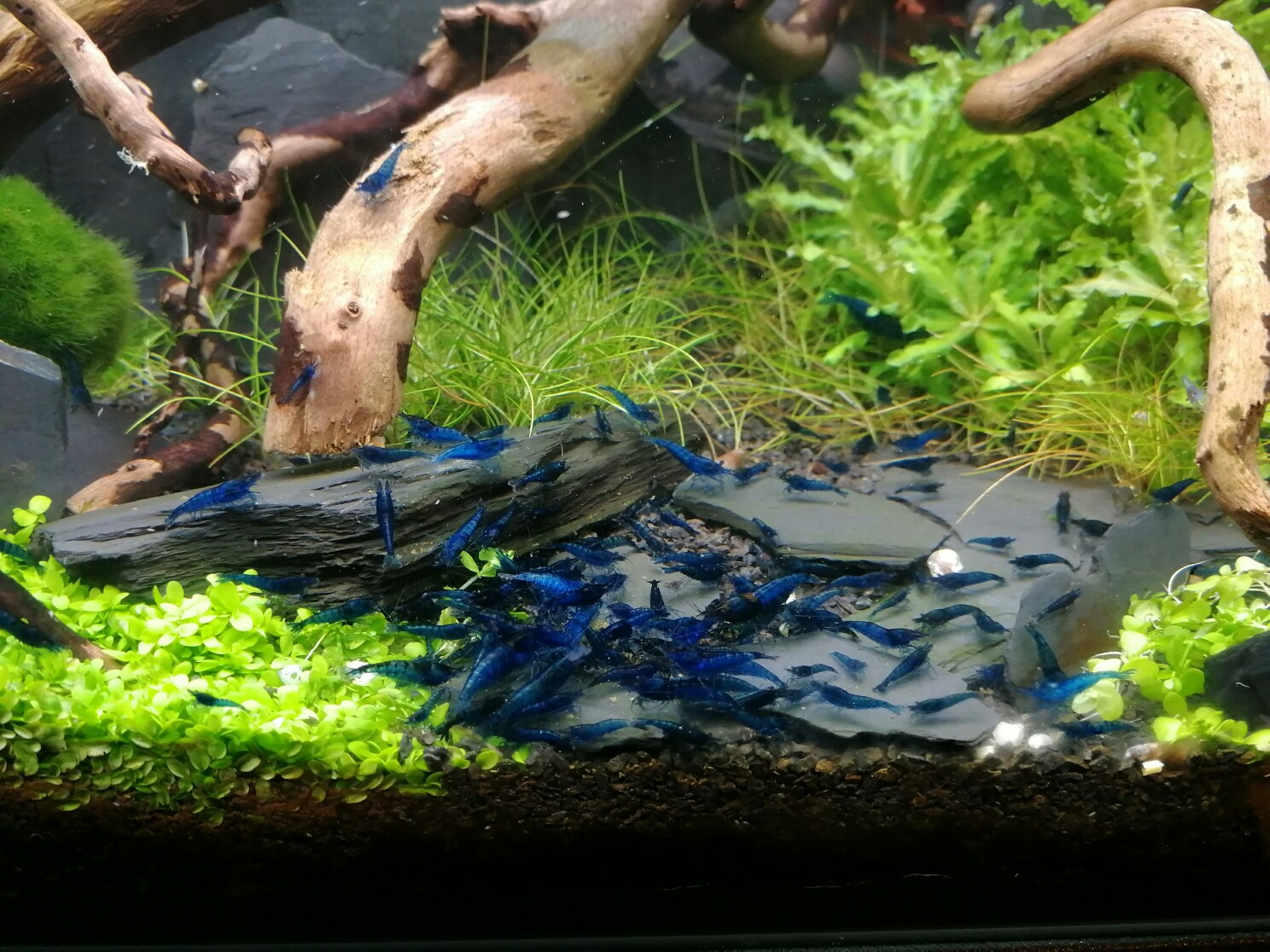 Bild "..._195308-..." mit der ganz hellblauen Garnele und die im aktuellen Bild, mittig auf der Schieferplatte sieht aus wie ein BlueRili-BlueJelly.