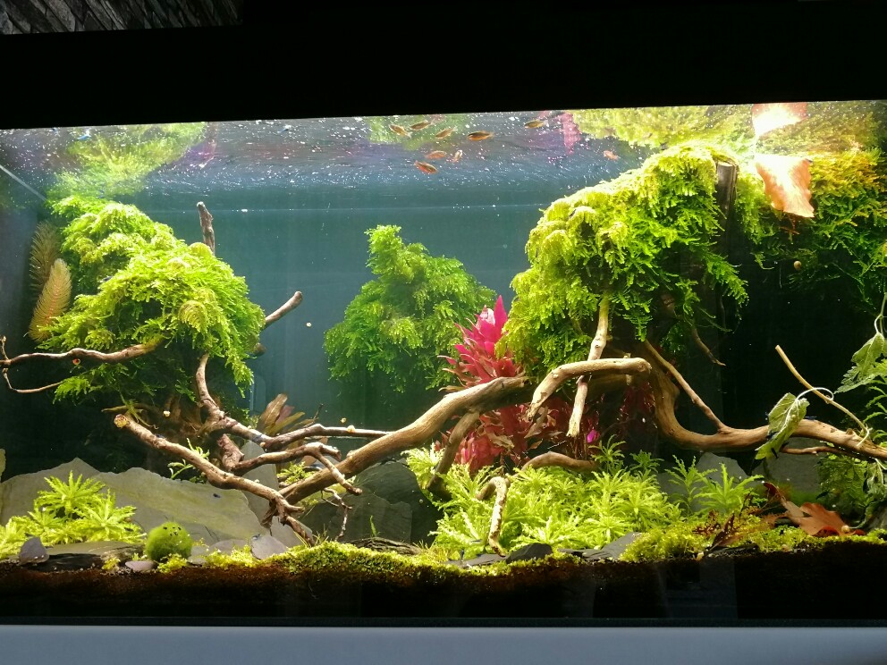 Mit der Entwicklung der Pflanzen bin ich nur teilweise zufrieden. Gut wachsen tut die Eleocaris, auch Pogostemon und Micranthemum passt. Des Moos explodiert, muss ich jetzt unbedingt mal wieder a weng zähmen. Wie prophezeit hält eine der Mooswolken nicht mehr, aber vll müssen sie eh weichen. Sie nehmen zu viel Licht weg. Mein Alternanthera leidet sehr, habs jetzt schon zentraler gesetzt, hoffe es wird da besser. Ich denke ich setz im Hintergrund noch ne größere Pflanze, liebäugeln würde ich mit nem Tigerlotus, mal schauen...