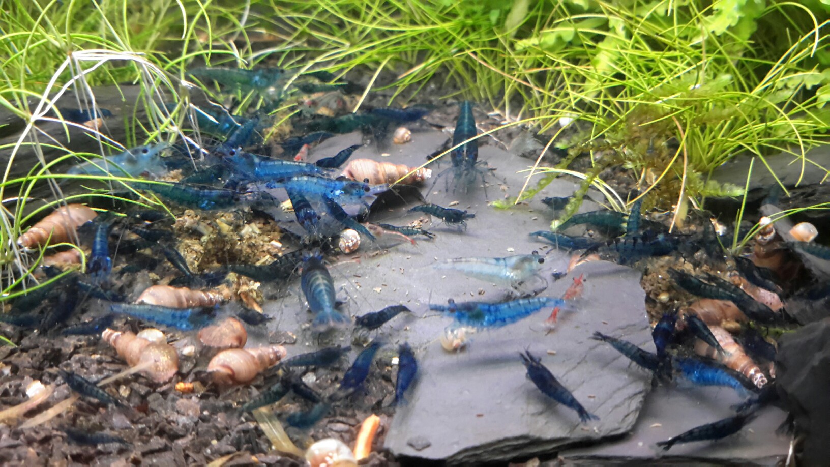 Bild "..._195308-..." mit der ganz hellblauen Garnele und die im aktuellen Bild, mittig auf der Schieferplatte sieht aus wie ein BlueRili-BlueJelly.