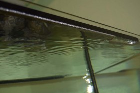 Da das Wasser nach wenigen Stunden dermaßen klar ist, kann man zur Zeit die Strömung nur an der gekräuselten Wasseroberfläche erahnen. Ein Zeitungspapierzipfel brauchte einige Zirkulationsrunden um in die Nähe des Bodens zu gelangen. Das Becken hat insgesamt 300 L und für die Tiere dann eine nutzbare Bodenfläche von 150 x 50 cm. Der dekorative Teil nur 110 x 50 cm weil je 20 cm für die Ansaug- und Ausstoßseite gebraucht wird. Wie ich meine Jungs kenne werden sie da wo es "hart" hergeht, auf den Rosten sitzen. Die Gabuns sicher nicht, da sie nicht gerade zum Exhibitionismus neigen.