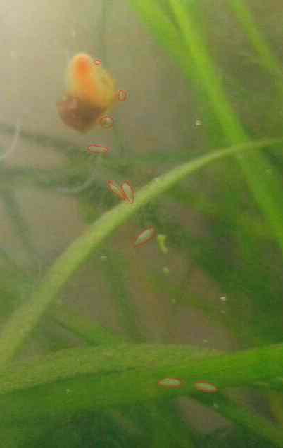 Die weißen Punkte (auf dem zweiten Bild in rot markiert) sind kleine Viecher - circa 1mm lang, weiß, länglich-oval, kleben gern an der Scheibe, sitzen aber auch auf dem Mini-Schneck (zum Vergleich: Mini-Schneck ist etwa 5mm lang).