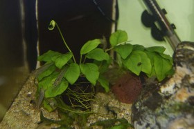 Ich hatte vor mal einen vorher/nachher Test zu machen um zu sehen was die Tierchen zu leisten vermögen. Also habe ich eine schlimm bewachsene Anubias bei den „Jungs“ ins Becken getan und bin rauf um die Kamera für das Vorher-Bild zu holen.