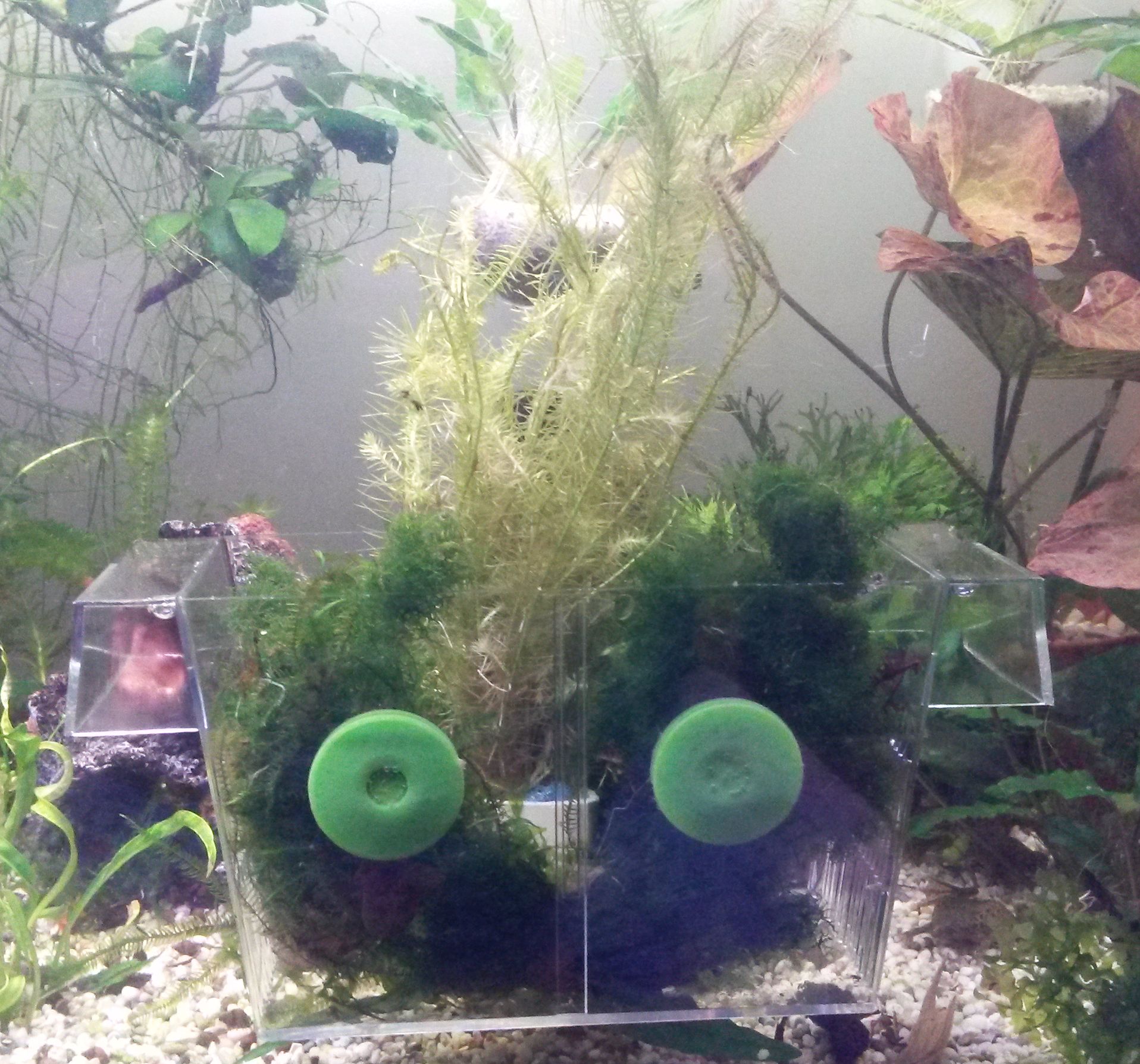 Ein Mini konnte ich schon rausfangen und ins Aufzuchtbecken setzen. Das andere hat sich versteckt oder ist den Mitbewohnern in der Zwischenzeit zum Opfer gefallen.