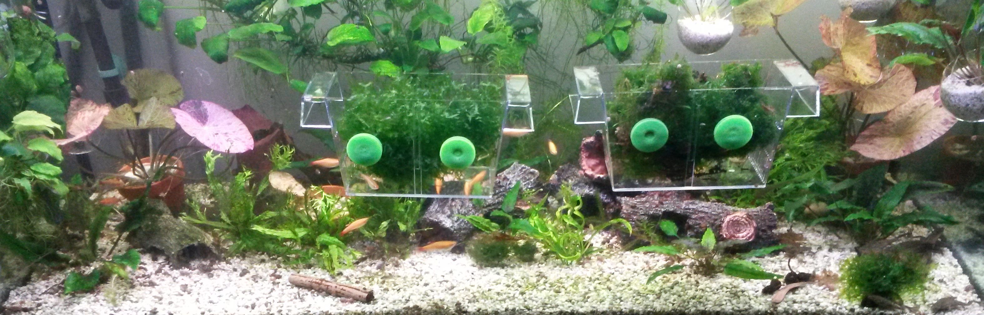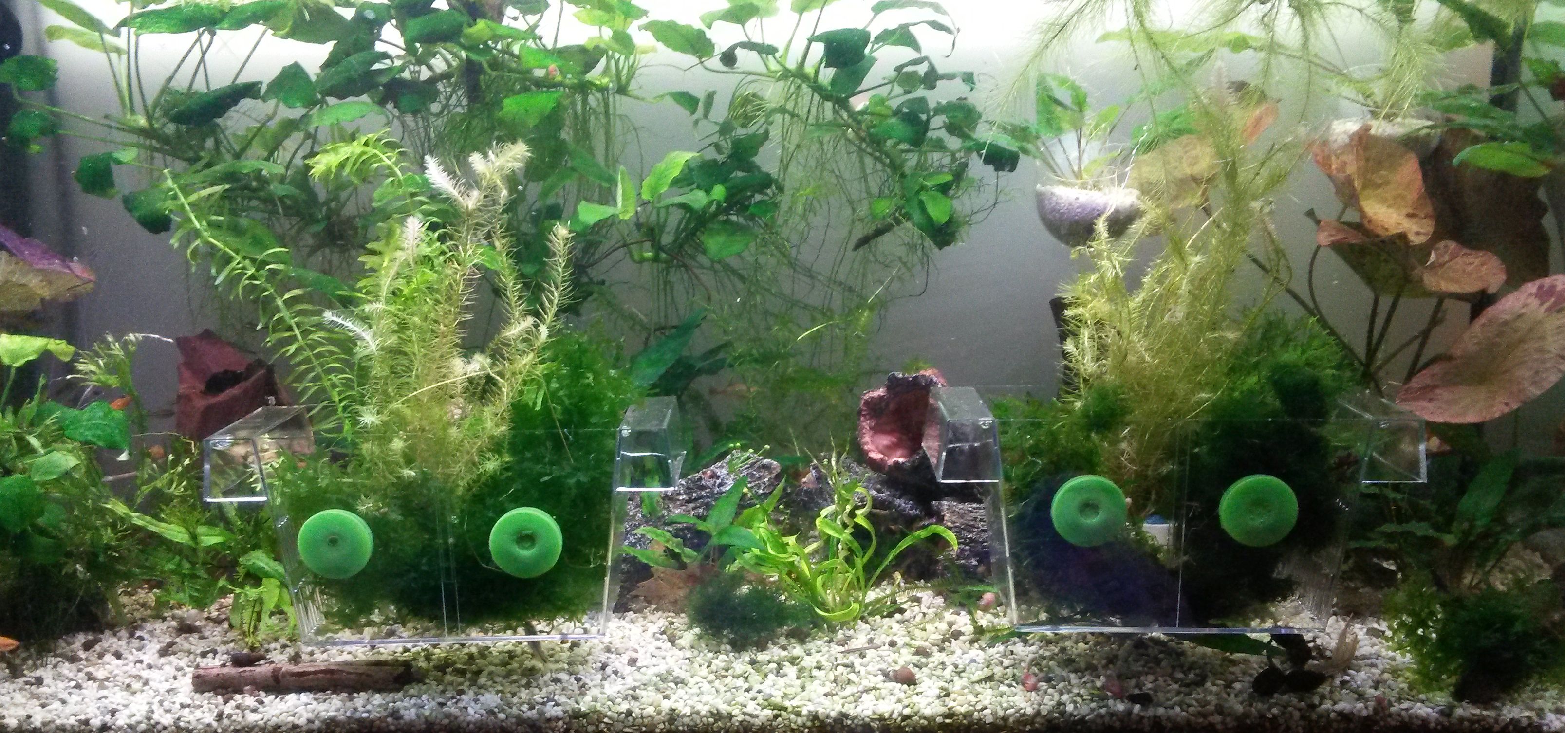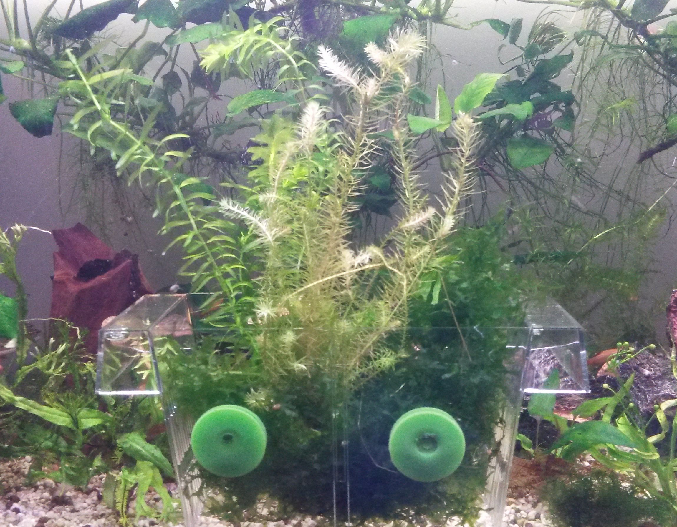 Ein Mini konnte ich schon rausfangen und ins Aufzuchtbecken setzen. Das andere hat sich versteckt oder ist den Mitbewohnern in der Zwischenzeit zum Opfer gefallen.