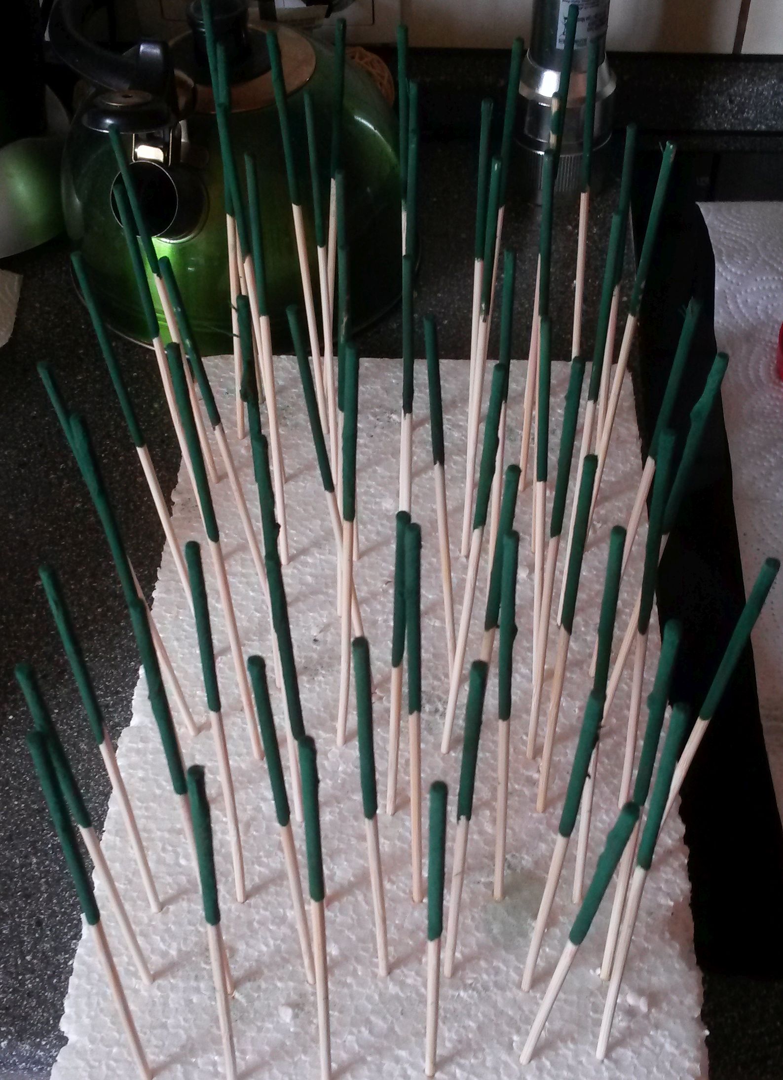 Ich hab einfach die Schaschlikspieße angefeuchtet, ins Spirulinapulver getaucht und dann trocknen lassen.