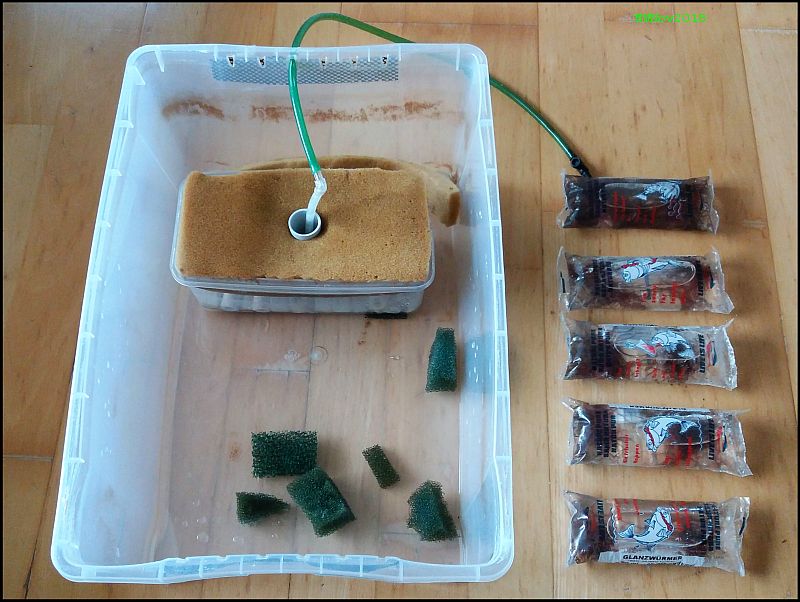Das ist eine flache, 10 Literkiste, mit Deckel. Im Filter sind noch Filterröllchen und obenauf feiner Polsterschaumstoff, der schon vorher als Filter für was anderes gedient hatte.