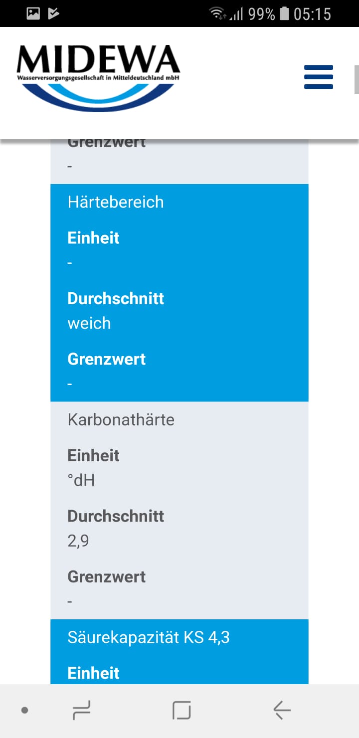 Vielen Dank erstmal für eure Antworten. Also ich habe die Werte dreimal innerhalb von 2 Stunden gemessen und es kommt immer wieder das selbe raus. Wir haben hier bei uns in der Gegend verdammt weiches Wasser. anbei mal die Werte von unserem Wasserversorger. Ich habe schon überlegt ob ich ein paar Austernschalen vom Koiteich nehme und ins Wasser schmeisse bzw. gibt es natürliche Alternativen den Wert zu erhöhen? Mit Auqarienläden sind wir hier sehr, sehr dünn besetzt. Ach ja, habe mit Teststreifen gemessen.