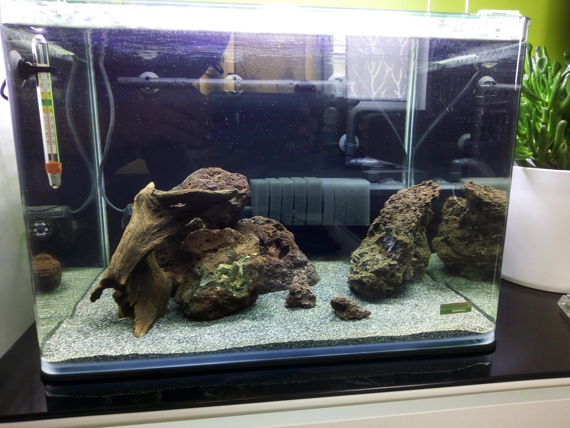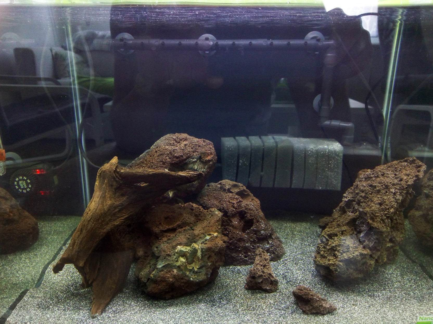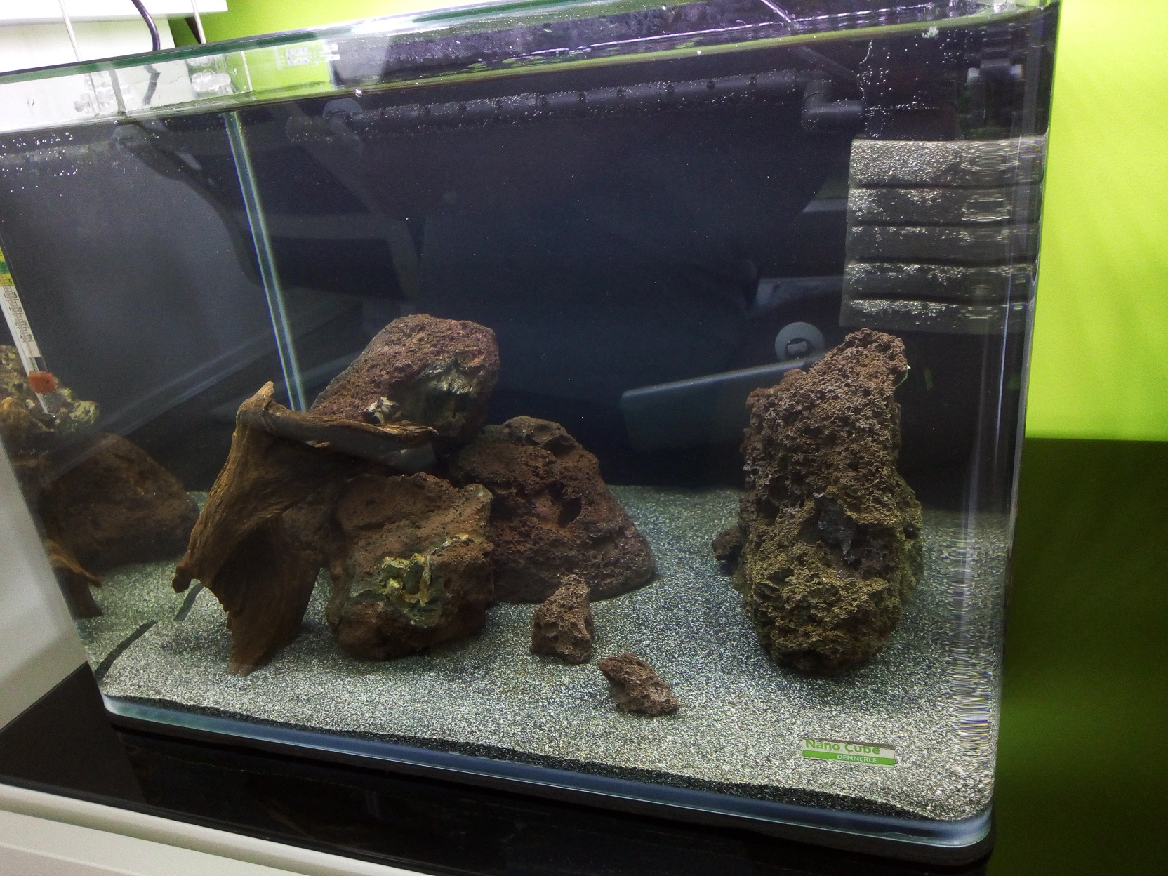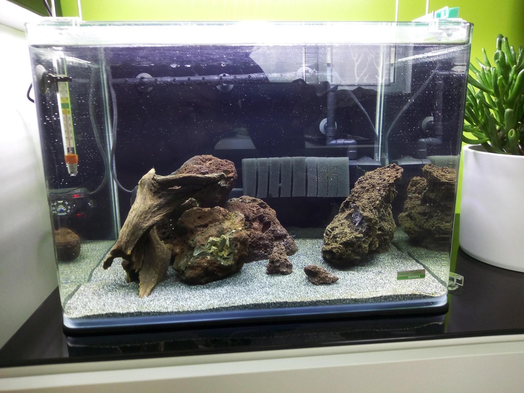 meine vorherigen Becken habe ich auch meist mit der Wurf-Methode eingerichtet, was aber mit fein verästeteln Wurzeln und Pflanzen bissl einfacher erscheint. Da war ich auch immer froh, dass mir das Garnelenhaus wunderschöne Wurzeln geschickt hat. Sei es drum. Die Möglichkeiten hier waren etwas karger.