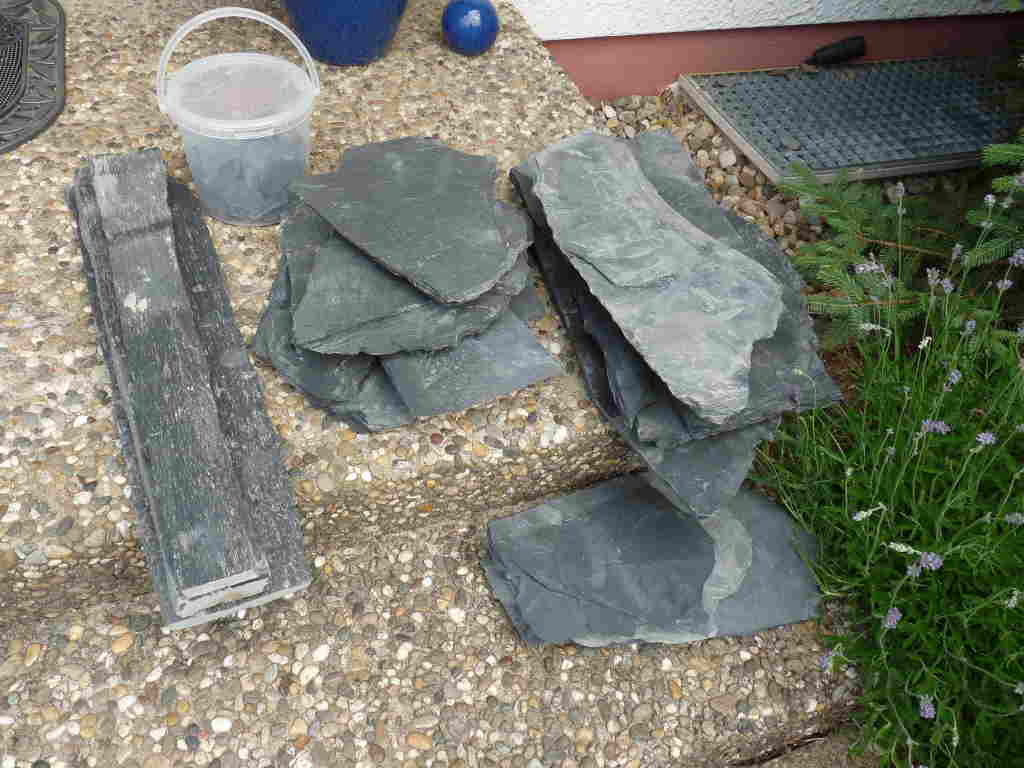 Am Freitag also den Brückentag sinnvol genutzt und für mein neues Grundelbecken mal schwarze Schieferplatten eingekauft.