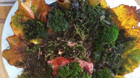 Mit den Moosen hab ich auch experimentiert- nur kleine Menge reingeholt (ich will ja nichts zerstören) und gleich einen Herbstteller mit Blättern und Steinen draus gemacht. Schön feucht gehalten, vielleicht wächst das Moos ja auf den Steinen fest damit ich dann die submerse Variante versuchen kann.