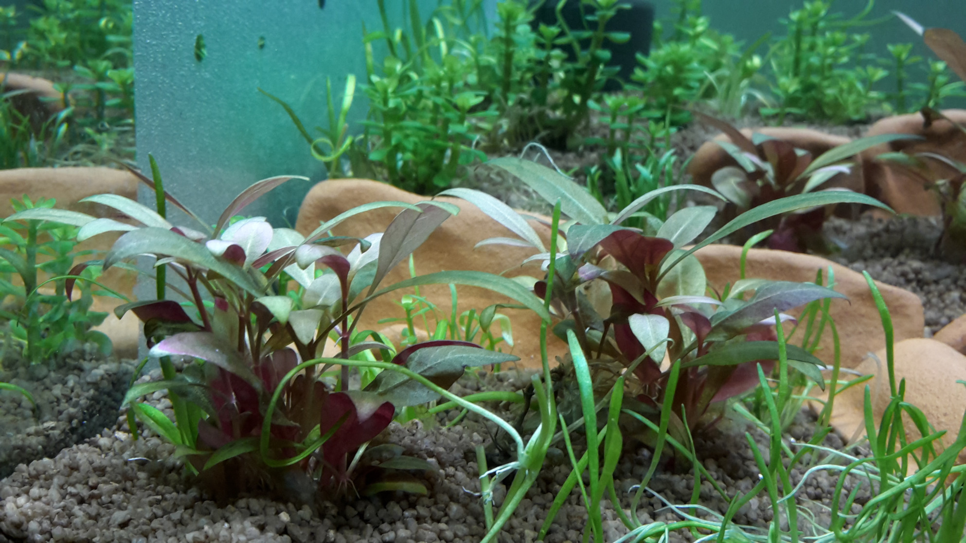 Das Lilaeopsis im Vordergrund steht momentan noch etwas "kraut-und-rübig", aber das sortiert sich bestimmt noch. Die Rotala und die Alternanthera sahen anfangs auch eher wurschtelig aus, wachsen jetzt aber ganz zivilisiert vor sich hin. Der Alternanthera kann man praktisch dabei zugucken, wie neue Blätter sprießen.
