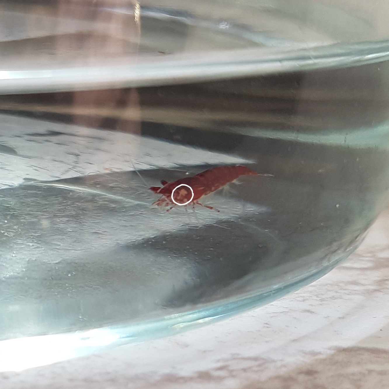 heute hab ich es wieder entdeckt. Habe die Garnele erstmal in ein anderes Gefäß gepackt, um ein Foto zu machen. Leider hält die nicht still... Man kann es jedenfalls nicht mit einem Wattestäbchen abstreifen. Vielleicht könnt ihr nun mehr erkennen. Ich versuche noch ein bessetes zu machen.