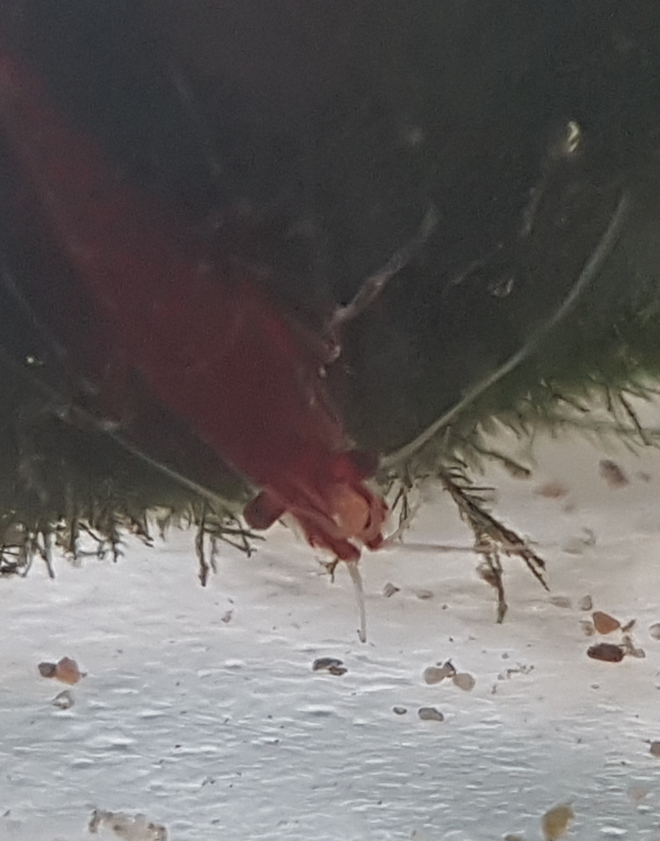 heute hab ich es wieder entdeckt. Habe die Garnele erstmal in ein anderes Gefäß gepackt, um ein Foto zu machen. Leider hält die nicht still... Man kann es jedenfalls nicht mit einem Wattestäbchen abstreifen. Vielleicht könnt ihr nun mehr erkennen. Ich versuche noch ein bessetes zu machen.