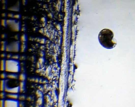 Ja, diese Neritiden sind wirklich eine harte Nuss... Wie weiter oben schon vermutet, ist das Problem die Aufzucht und Metamorphose der Schneckenlarven... ich selbst bin mit den Tierchen bis etwa 60 Tage gekommen (s. Bild; das Gitter ist 0,1 mm weit), was beachtlich bzw wohl Rekord ist. Aber sehr schlechte Überlebensrate und noch keine klaren Anzeichen von Metamorphose.