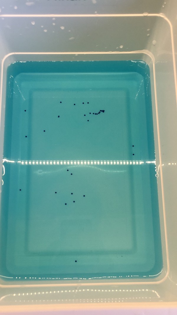 Die kommen so blau an das man nicht mal mehr das innere erkennen kann. Das kleine Fläschen habe ich auf 1,5 Liter Wasser verdünnt und es ist immer noch blauer als meine blaue Brühe. Erst nacch Stunden wurden die Eier wieder etwas durchsichitg. Aber einen Vorteil hatte es, man konnte sofort erkennen was nicht Papa hatte.