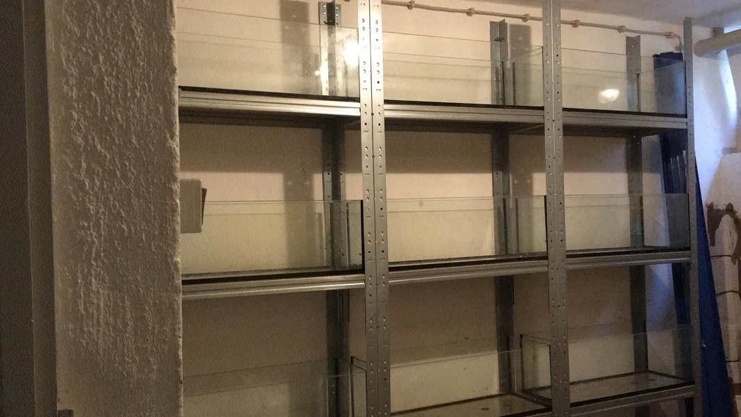 Erst mal ein paar Becken und Schwerlastregale besorgen. Die Becken gabs für fast lau. Sind niegelnagelneu verpackt nur leider fast 2 Jahre draußen rum gestanden, deshalb war gründliches Reinigen angesagt. Mit dem Hochdruckstrahler ging das prima und schnell.
