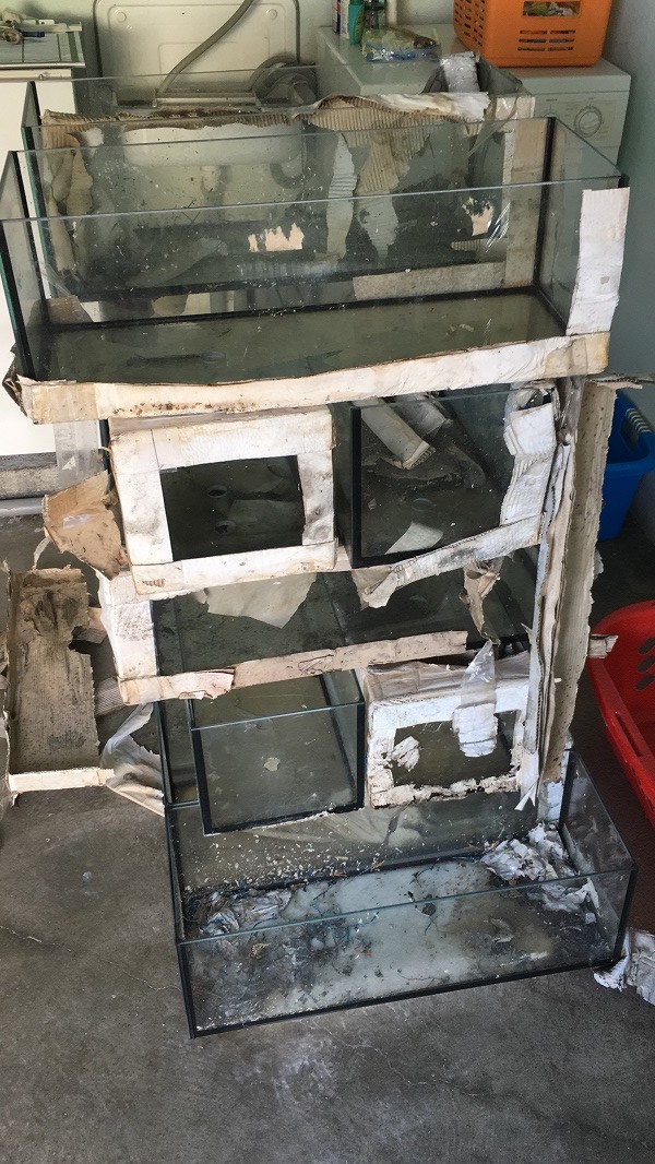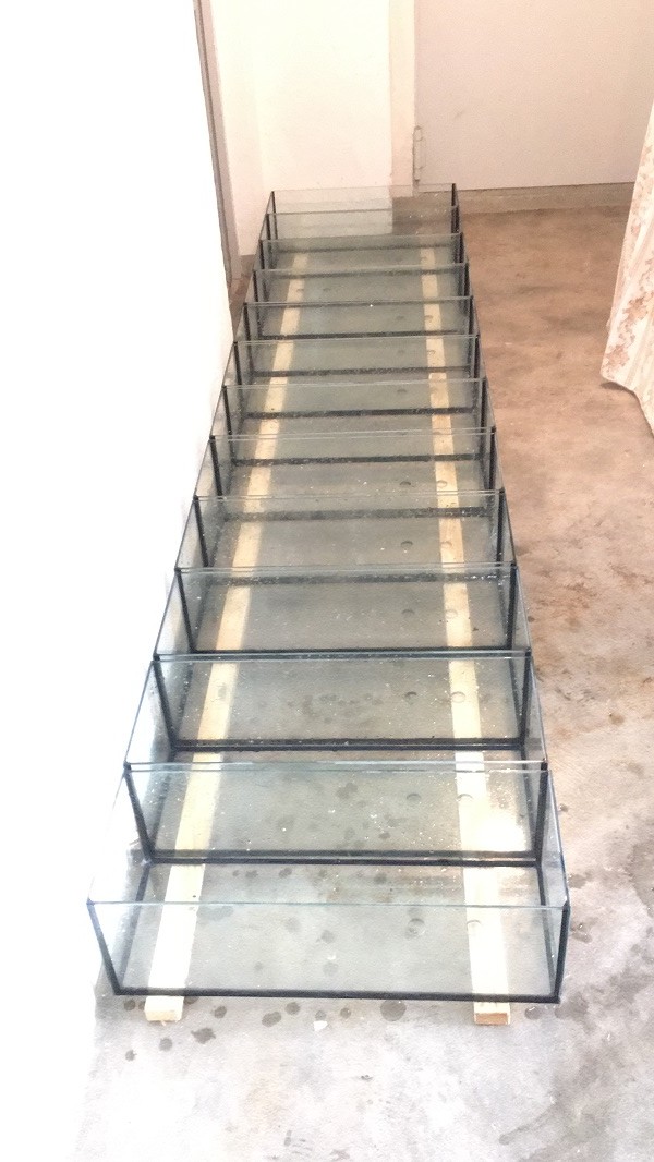 • Das sind keine Becken von der Stange. Eigentlich waren es mal Garnelenbecken zur Zucht. Es sind 25x25x65cm Pfützen. Eigentlich schon fast zu klein für Medakas. Aber zur Überwinterung wird es schon reichen.