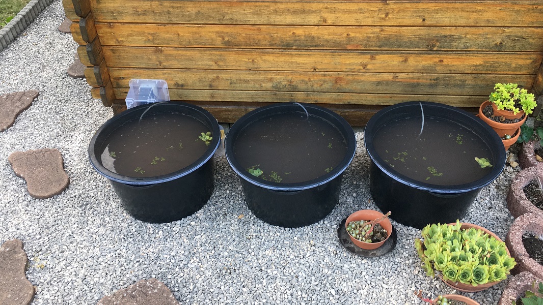 Die Becken haben unten 2 Löcher zum automatischen Wasserwechsel. Mal sehen was ich damit anstelle. Eigentlich keine schlechte Idee. Im Herbst füllen bis zum Überlauf und im Frühjahr einfach den Stöpsel ziehen. Muß mich mal um die Verrohrung kümmen.