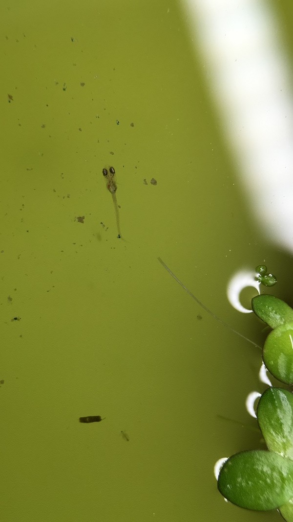 Was dann raus kommt, ist sowas. Ein winziges Fischerl mit endlosem Appetit. Grünes Algenwasser ist hilfreich, es hat die nötige Mikrofauna.