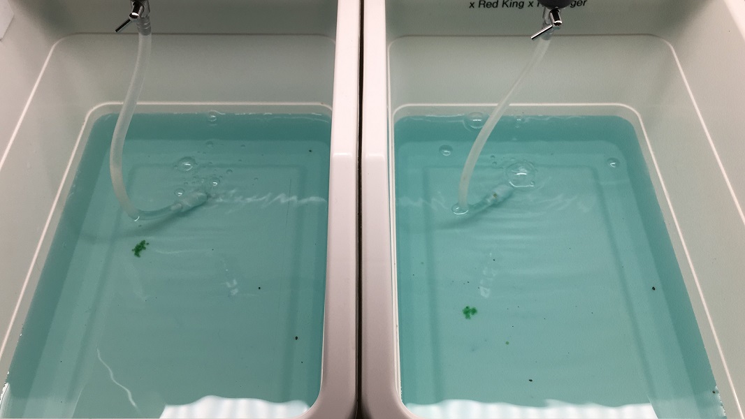 Kleine Brutanlage mit 2 Ikea-Behältern und etwas Blubber. Das bläuliche ist Methylenblau, es soll das Verpilzen der Eier verhindern. Ein paar winzige Blasenschneckerl dazu und die Eier bleiben sauber.