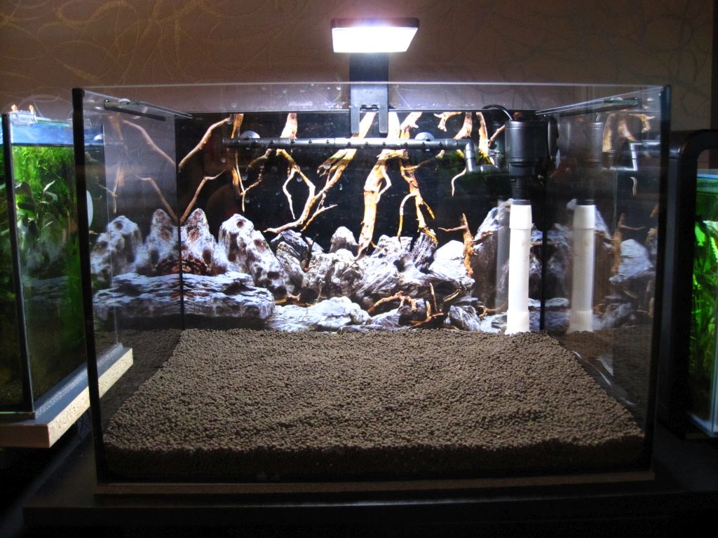 Ich hätte zwar gern hellen Bodengrund für meine Raccoons, aber leider habe ich verpasst, ob jemand weißen Soil entwickelt hat... ich denke, dass ist gar nicht machbar. Also kommt wieder Environment Soil hinein, BoFi und Circulator stehen bereit, denn dieser Tank hatte bislang herkömmliche Innenfilter. Davon will ich in allen Becken ab 40 Liter weg. Meine Minipfützen lassen sich problemlos mit nem JBL cristal profi m greenline filtern. Aber bei den größeren Aquarien mag ich den BoFi einfach lieber. Wartungsfrei und strömungsstark. Genau mein Ding.