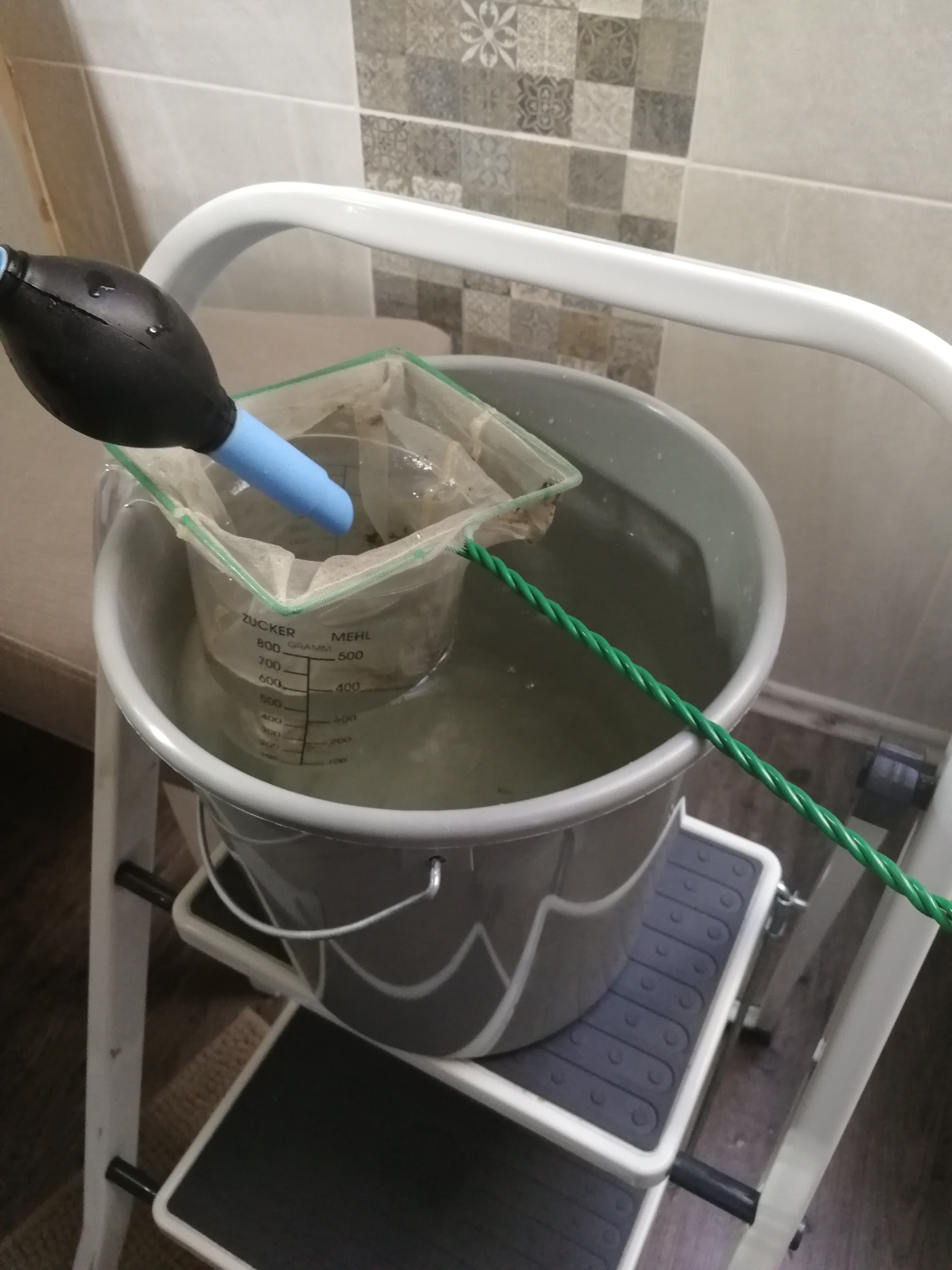 Damit niemand auf dem Trocken sitzen muss, häng ich einen Messbecher in den Eimer, dann wird darauf der Kescher gelegt.