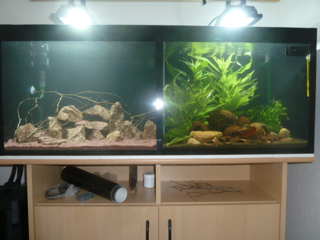 Da es bei mir auch ein "Garnelenbecken zwei in einem" geben muß habe ich kurzer Hand ein 1m Becken aufgetrieben,ne Glasscheibe zugeschnitten und eingeklebt.Somit habe ich 2 Becken 50x40x40.