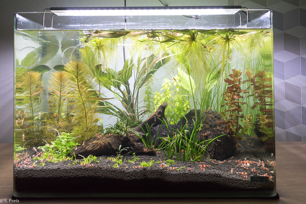 Das Becken ist ein Dennerle Scapers Tank 50, und es leben momentan ca 400 =O Red Bee Garnelen aller Größen darin.