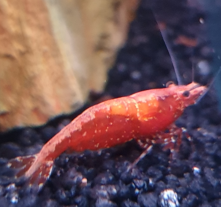 - Die weißen Punkte sind bei genauerem Hinsehen farblose Stellen am Körper, die aus der roten Neocaridina eine Red Fire machen, im Gegensatz zur roten Sakura, der durch herausgezüchtete Farbdeckung sämtliche transparente Stellen fehlen. Dann sind auch die Beine und der Schwanzfächer durchgefärbt.
