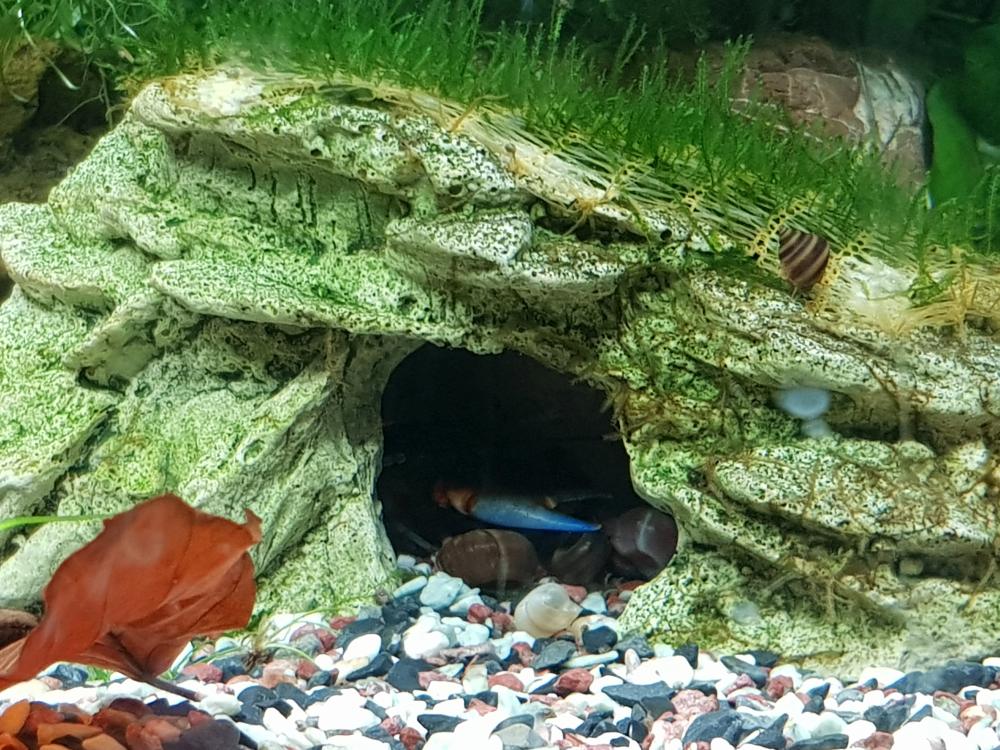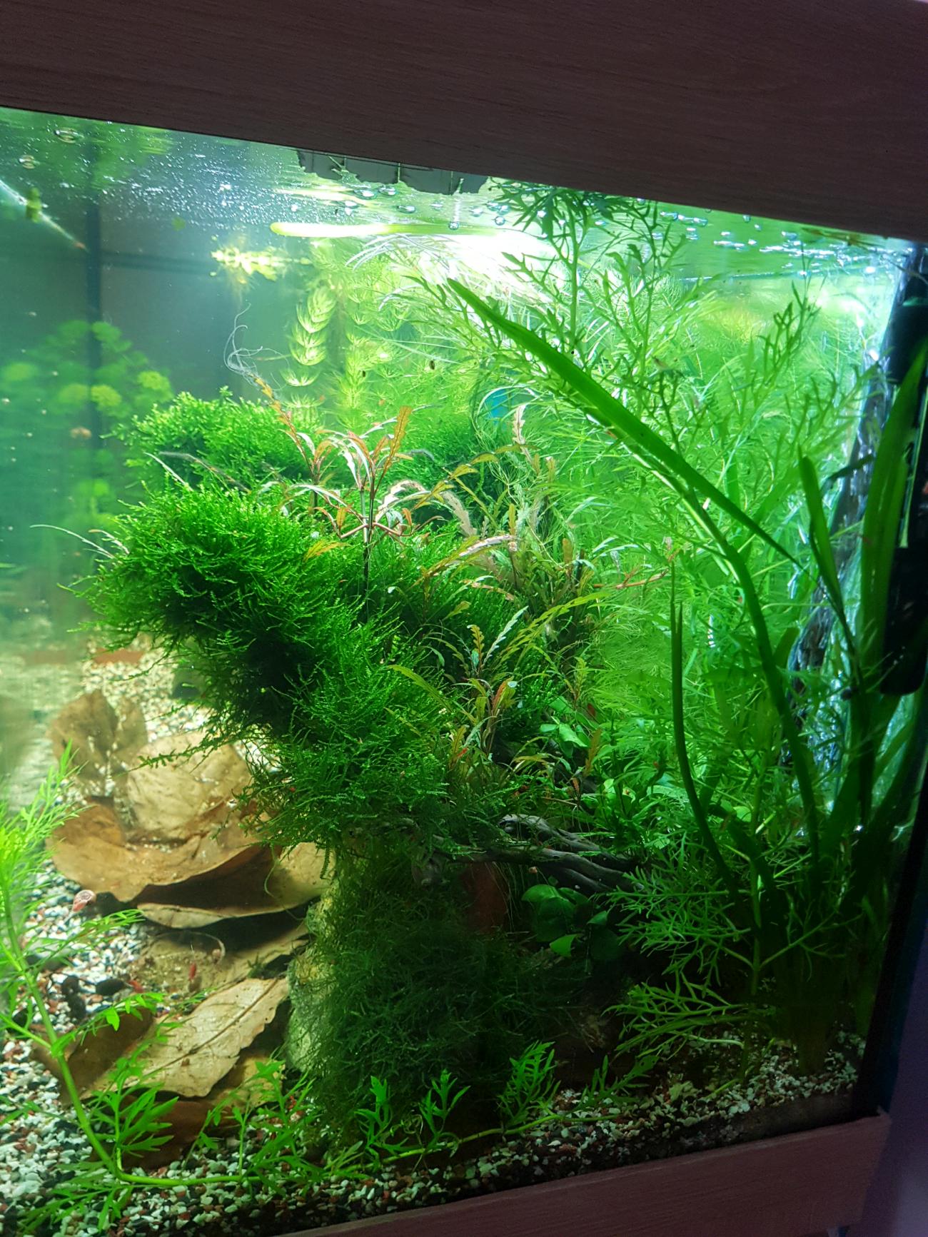 Das Becken selbst läuft jetzt seit Ende Januar 2019, ich habe versucht möglichst viele Höhlen und Verstecke mit einzubauen aber dabei auf Tonröhren Pakete und Ziegelsteine Verzichtet und stattdessen einen kleinen Berg aus Isarsteinen gebaut in welchem ich einige Höhlen verbaut habe- ausserdem gibt es zwischen den Steinen selbst ja auch reichlich Platz zum verkriechen. Rechts dann eine Größere Wurzel welche ich mit weeping moos und wasserfreund sowie ein paar kleineren Anubias begrünt habe, an sich habe ich versucht möglichst viele Aufsitzerpflanzen zu verwenden da diese nicht ausgegraben werden können, habe natürlich auch Stengelpflanzen im Becken welche ich noch vermehren muss um den Grünalgen etwas mehr Konkurrenz zu bieten. Auch Zwergnadelsimse ist dabei was aber ein Fehler war.