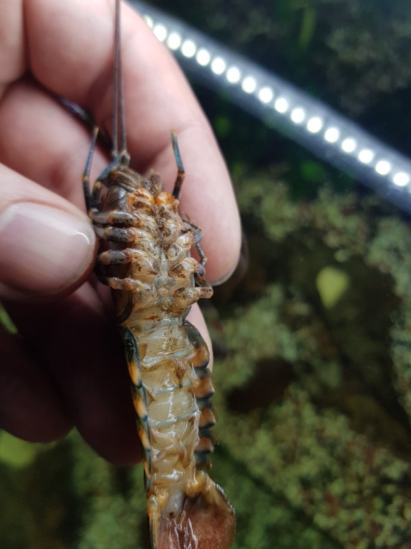Vor 5 Tagen kam dann der Besatz. Verpackung war super, Styroporbox, Heatpacks, jeder Krebs in einer eigenen Tüte- sah gut aus. Von den 25 red Sakura wurden 23 geliefert, da aber schon geschlüpfter Nachwuchs sowie einige hochträchtige Eiertanten im Beutel schwammen sehe ich das nicht so eng. Die Fächergarnelen waren ebenfalls sehr agil- war ganz überrascht wie die kleinen Pummelchen durch die Gegend geschossen sind. Die Krebse dagegen sahen nicht so gut aus, einem fehlten zwei Beine, zwei weitere Beine waren halb abgetrennt liessen sich aber noch etwas bewegen, an sich machte der Krebs einen sehr schwachen Eindruck, bewegte sich kaum. Ein weiterer Krebs hatte eine halb abgebrochene Schere sowie zwei fehlende Beine, war aber ansonsten relativ fit hat mich sogar fast erwischt -mit ihm dürfte es interessant werden, die anderen zwei waren bis auf einen Fehlenden Fühler und ein fehlendes Bein unverletzt und sehr aktiv, sind wie wild durch die gegend geflattert wenn ich sich umsetzen wollte. Nach drei Stunden Eingewöhnung (drei Eimer, Tröpfchenweise auf dreifache Wassermenge) gings dann ab ins neue Zuhause, die Fächergarnelen waren sofort verschwunden, die Garnelen machten sich über die Algen her als wär nix gewesen und die Krebse zankten sich kurz etwas und suchten sich, nachdem die Rangordnung geklärt war eine Höhle aus. Bis auf - nennen wir ihn Karl. Karl war der welcher schon im Beutel einen schwachen Eindruck machte und auch im Becken keine Höhle suchte sondern erstmal 30 Minuten durchs Becken stolperte während die Anderen noch beim Armdrücken waren. Schließlich blieb Karl in einer Pflanze hängen, das ganze sah sehr unkoordiniert aus. In der Pflanze hängend bewegte er sich dann weiter ohne das seine Bewegungen irgend einen Sinn ergaben noch etwas an seiner Situation veränderten. Das eine Bein wedelte in der Luft rum, die Schere schien zu winken- hätte ich es nicht besser gewusst hätte ich gesagt Karl war total besoffen und ist mit dem Fahrrad in eine Hecke gefallen. Ich habe ihm dann aus der Pflanze raus geholfen woraufhin er noch ca 20cm weiterkrabbelte und schließlich halb auf der Seite liegend auf einem Seemandelbaumblatt stoppte, es war 22 Uhr und das Licht ging aus. Am nächsten Morgen war Karl verschwunden, die drei anderen Krebse waren dagegen wohlauf und hatten sich gut eingelebt, jeder in einer Höhle gut verteilt über das komplette Becken. Karl aber habe ich bis heute nicht mehr gesehen. Einige Höhlen gehen bis zu 30 cm Tief in den Steinhaufen hinein, dahinter sind grössere Hohlräume mit Kies verfüllt. Ich habe gesehen das zumindest aus einer dieser tiefen Höhlen Kies rausgeschoben wurde- ich schätze also Karl hat sich darin verkrochen. Da er nun schon vier Tage darin sitzt mache ich mir Sorgen das er darin verendet- rausbekommen würde ich ihn dann nur wenn ich den kompletten Steinhaufen auseinander baue (hätte ich mal vorher dran denken sollen), andererseits hoffe ich auch das seine drei Artgenossen in dem Fall ein wenig Gesundheitspolizei spielen werden und sich der Sache annehmen. Ist es normal das Krebse sich manchmal über längere Zeit verkriechen? Welche Erfahrung habt ihr mit cherax peknyi gemacht?