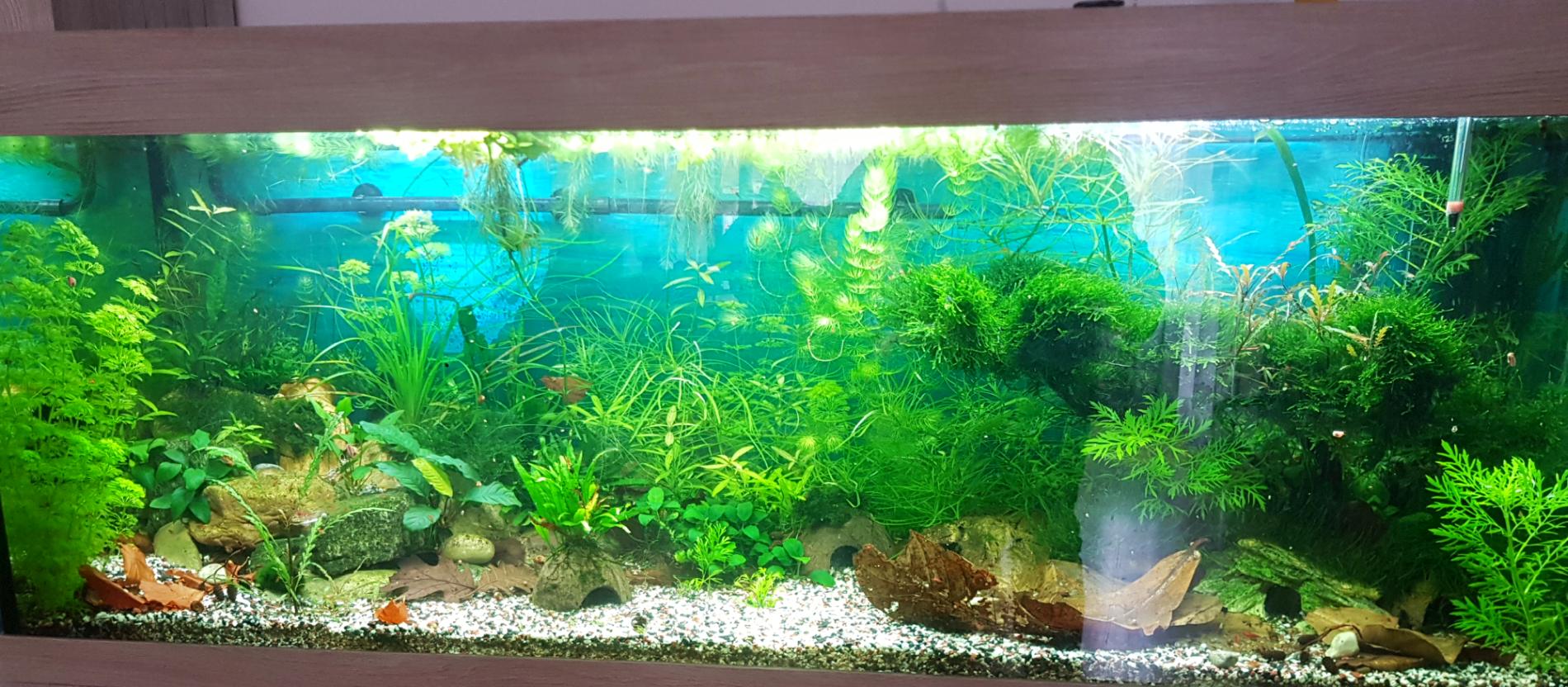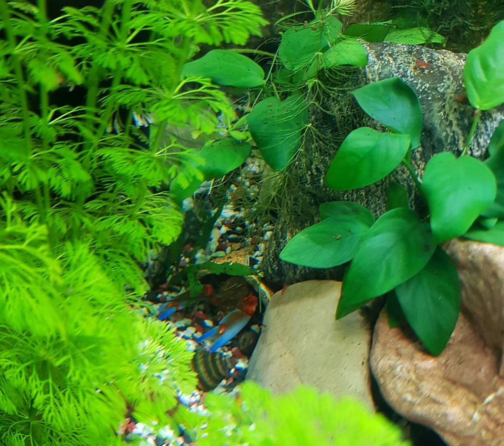 Das Becken selbst läuft jetzt seit Ende Januar 2019, ich habe versucht möglichst viele Höhlen und Verstecke mit einzubauen aber dabei auf Tonröhren Pakete und Ziegelsteine Verzichtet und stattdessen einen kleinen Berg aus Isarsteinen gebaut in welchem ich einige Höhlen verbaut habe- ausserdem gibt es zwischen den Steinen selbst ja auch reichlich Platz zum verkriechen. Rechts dann eine Größere Wurzel welche ich mit weeping moos und wasserfreund sowie ein paar kleineren Anubias begrünt habe, an sich habe ich versucht möglichst viele Aufsitzerpflanzen zu verwenden da diese nicht ausgegraben werden können, habe natürlich auch Stengelpflanzen im Becken welche ich noch vermehren muss um den Grünalgen etwas mehr Konkurrenz zu bieten. Auch Zwergnadelsimse ist dabei was aber ein Fehler war.