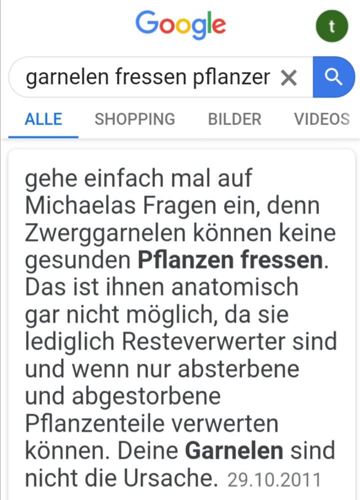 Hallo, ich habe bisher gedacht, dass die Garnelen nur abgestorbene Pflanzen fressen, aber das hier sieht nicht so aus... In meinem Becken befinden sich nur Bienen und ein paar, so 3-4, Schneckenbabies, die bei der Einrichtung des Backens eingeschleppt wurden. Ich vermute, dass die Bienen beim intensiven Aufwuchsfressen auf den Geschmack gekommen sind? Dank Bacter AE gibt's ja reichlich im Becken. Haben sie einen Gemüsemangel?